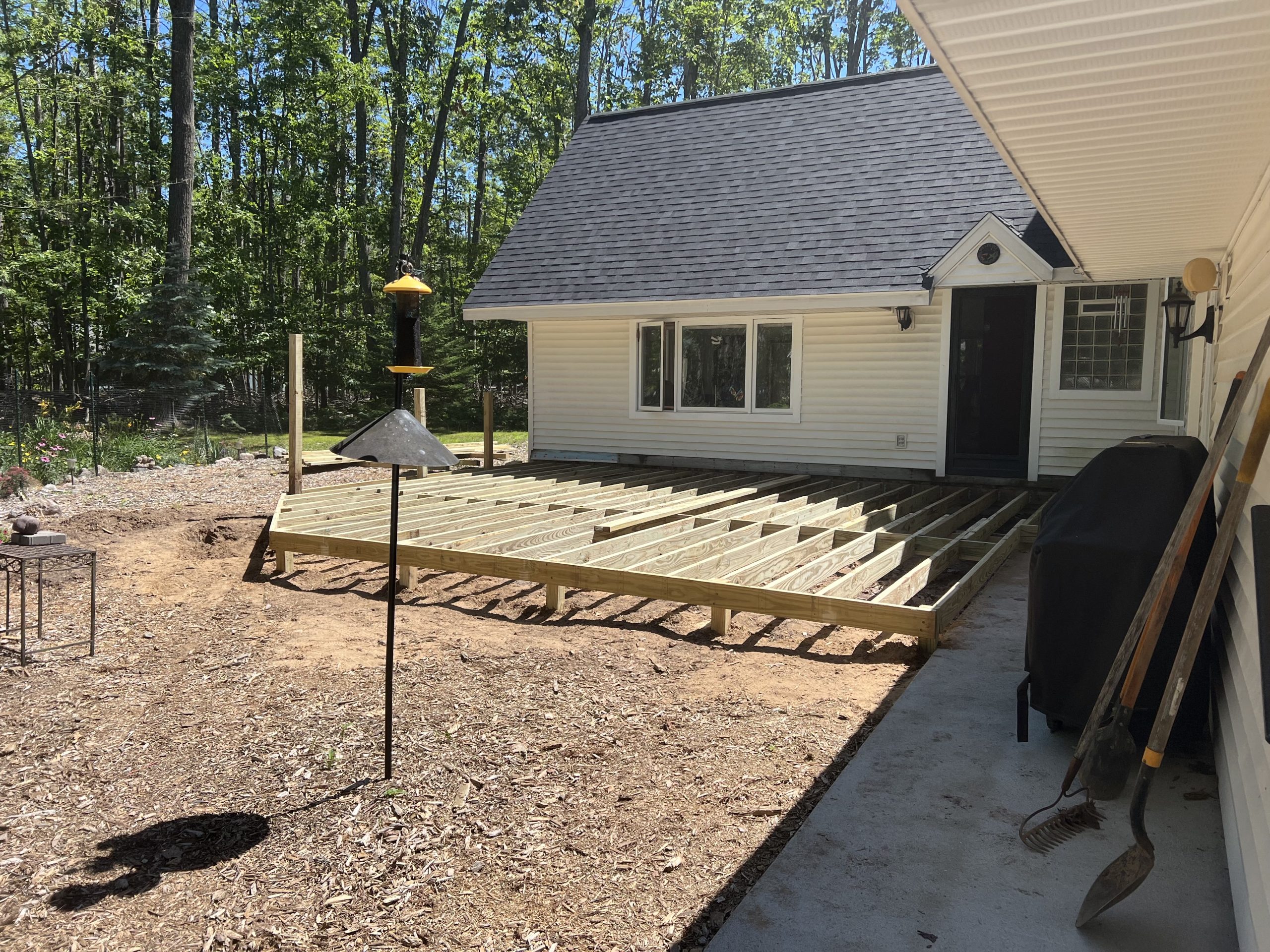 The client wanted to re-design his outdoor living space. We changed, added and removed different parts of his existing deck. Then we created two outdoor living spaces for him and his dog to enjoy during the beautiful Michigan summer months.
